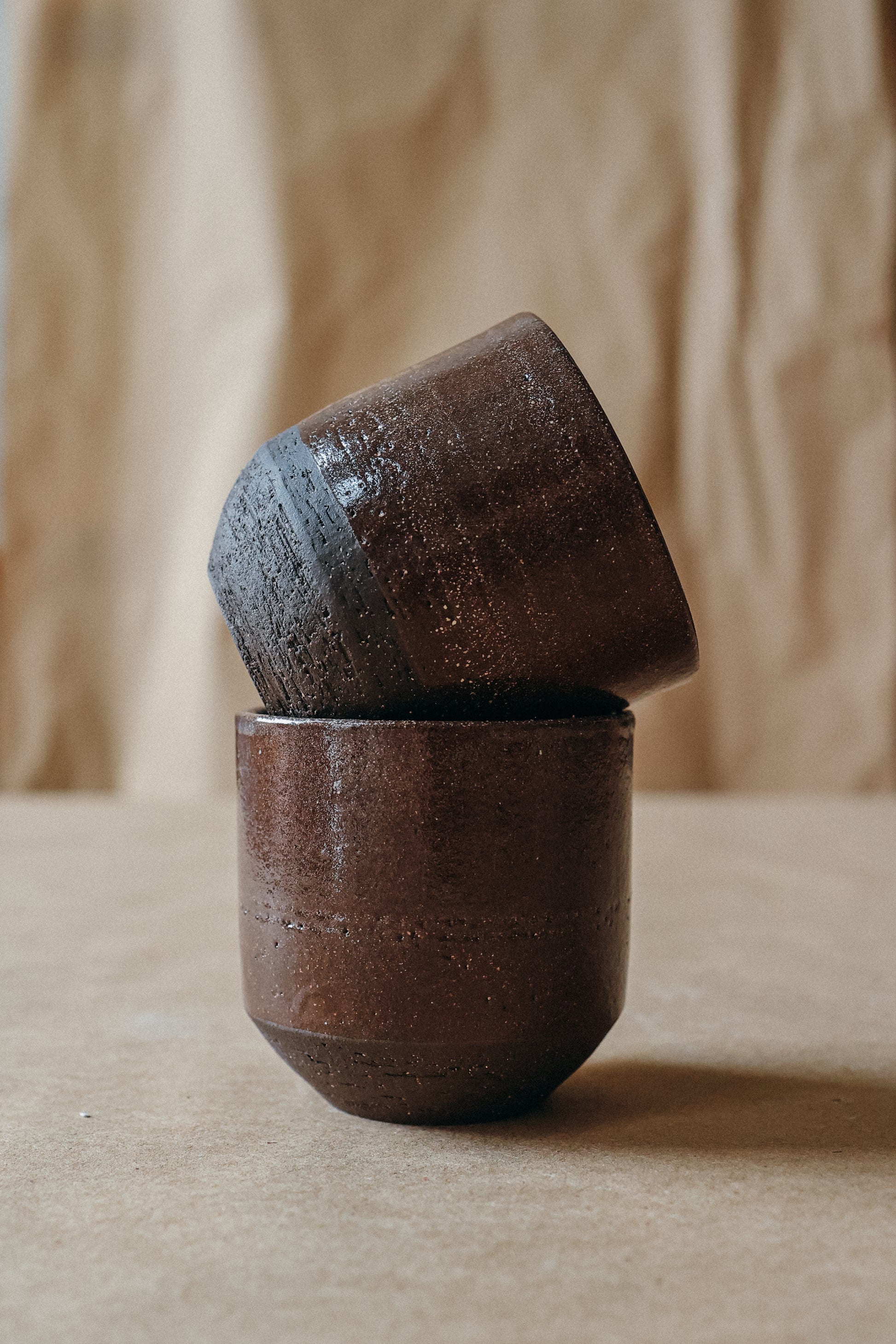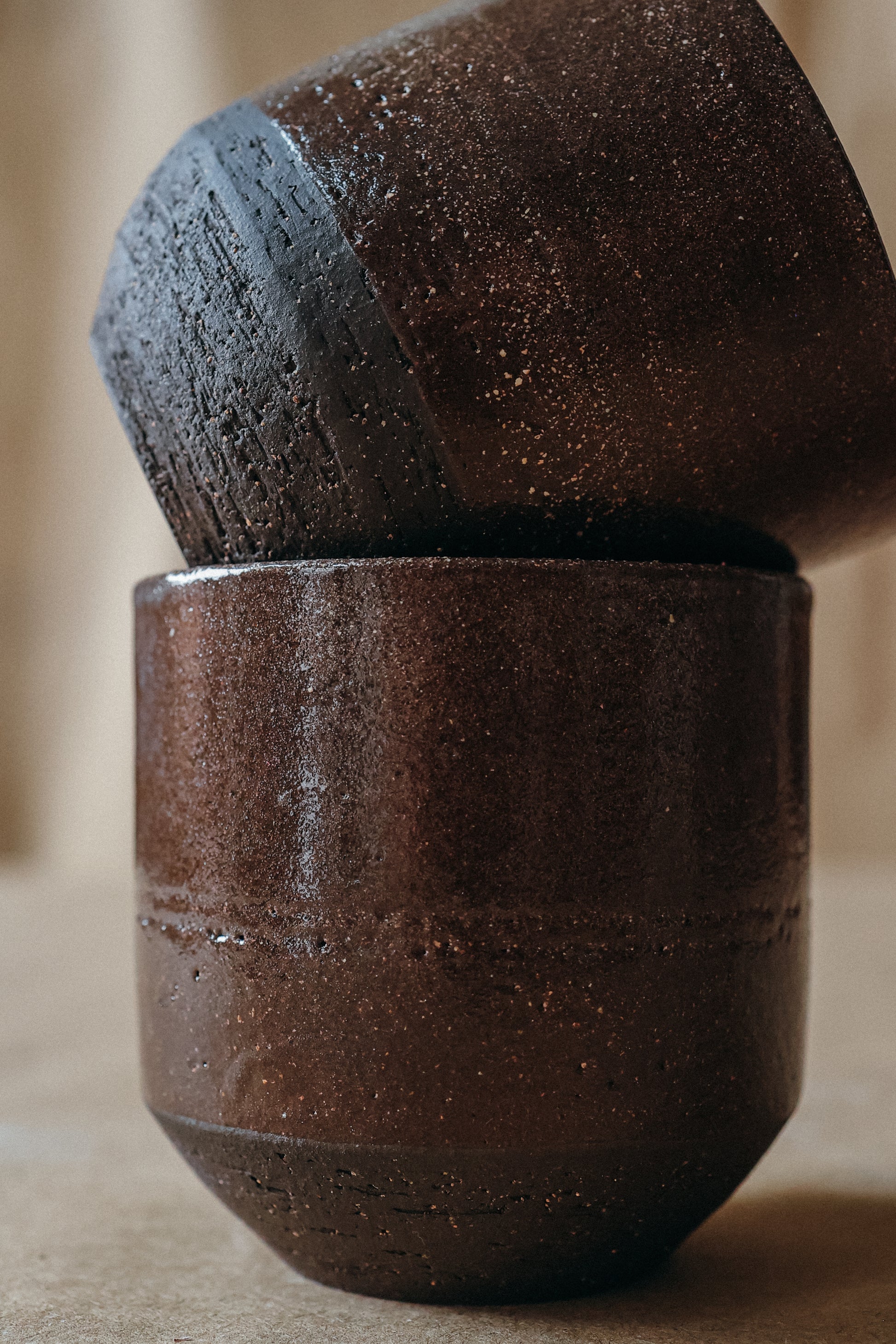 Таку форму горняток для кави ми особливо полюбляємо і для фільтру, і для порції капучіно. Як і у всіх серіях нашого кам'яного посуду, натхненного ландшафтами Криму, зовні поєднуються текстура глиняного черепка та гладкий шар скла. Горня зручно тримати в долоні при напої температурою до 80℃.